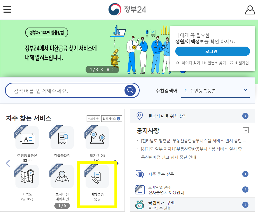 정부24 웹페이지에서도 [예방접종증명]을 통해 코로나 백신 접종증명서를 발급 받을 수 있습니다.