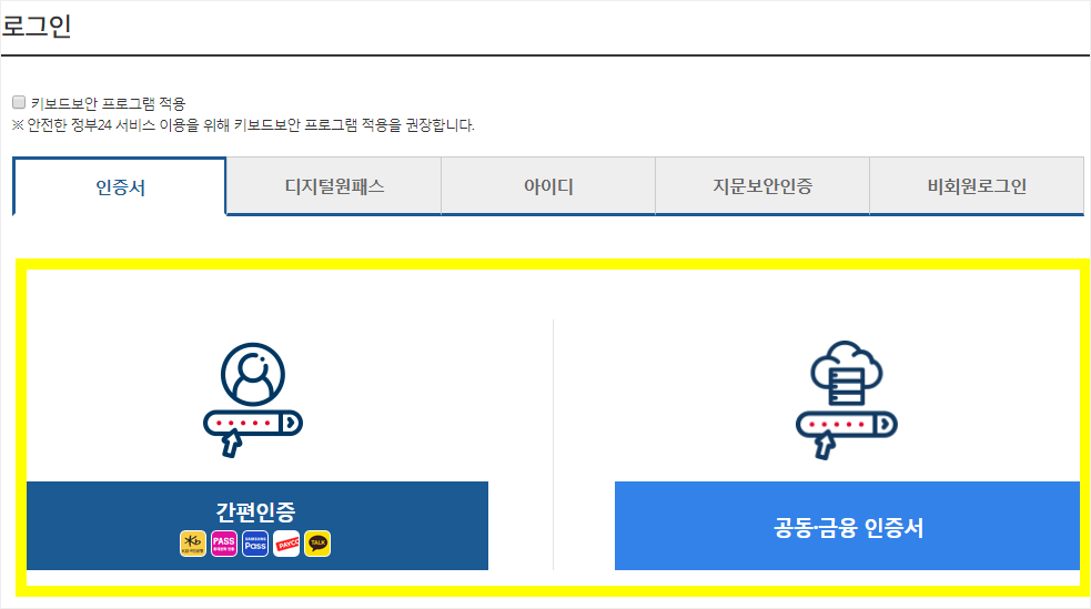'금융기관의 공인인증서' 또는 '간편인증'으로 본인인증을 할 수 있습니다.